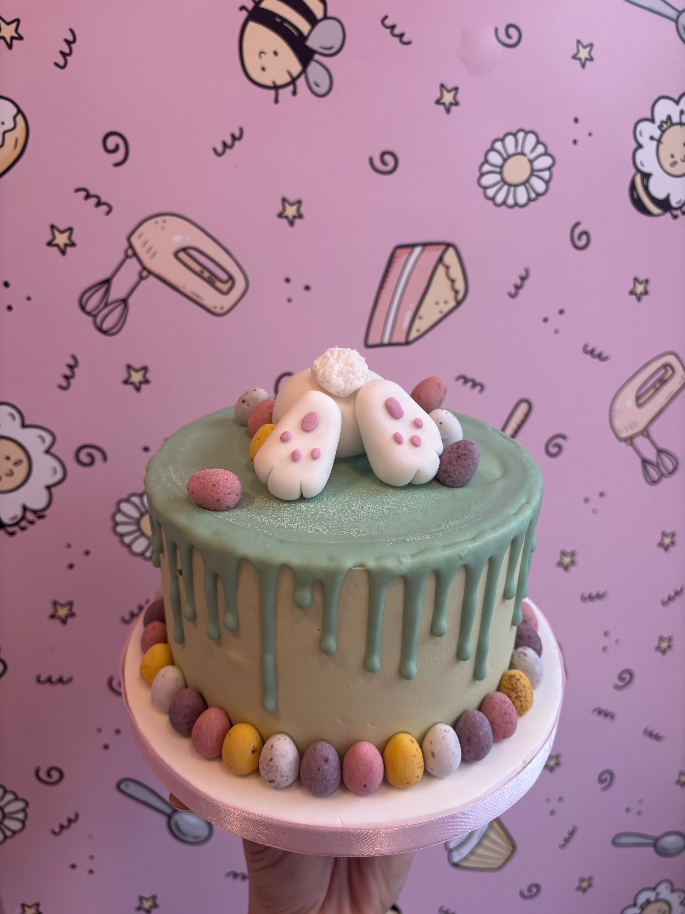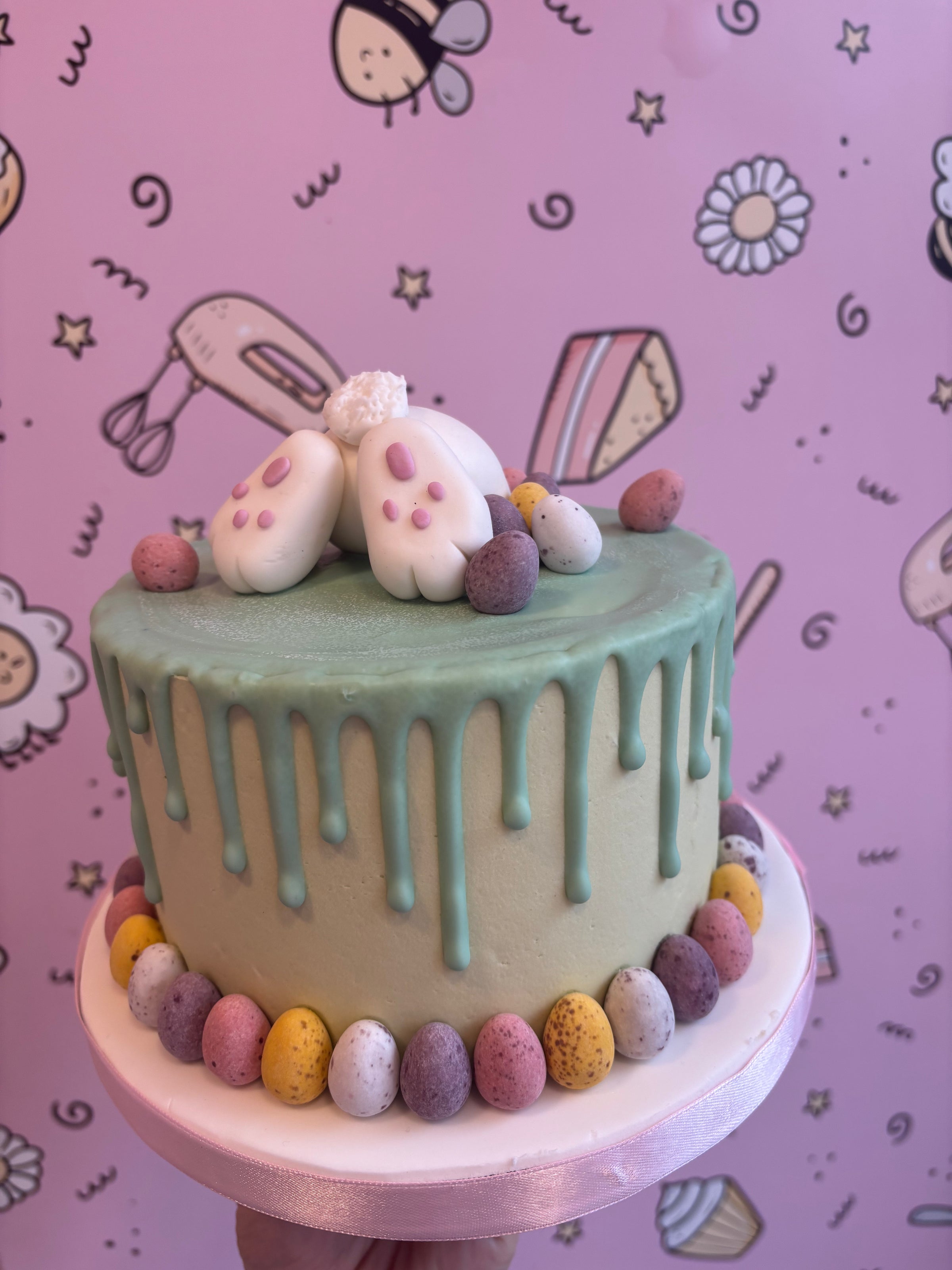 6” cake filled with raspberry jam and buttercream and topped with white chocolate drip and mini eggs