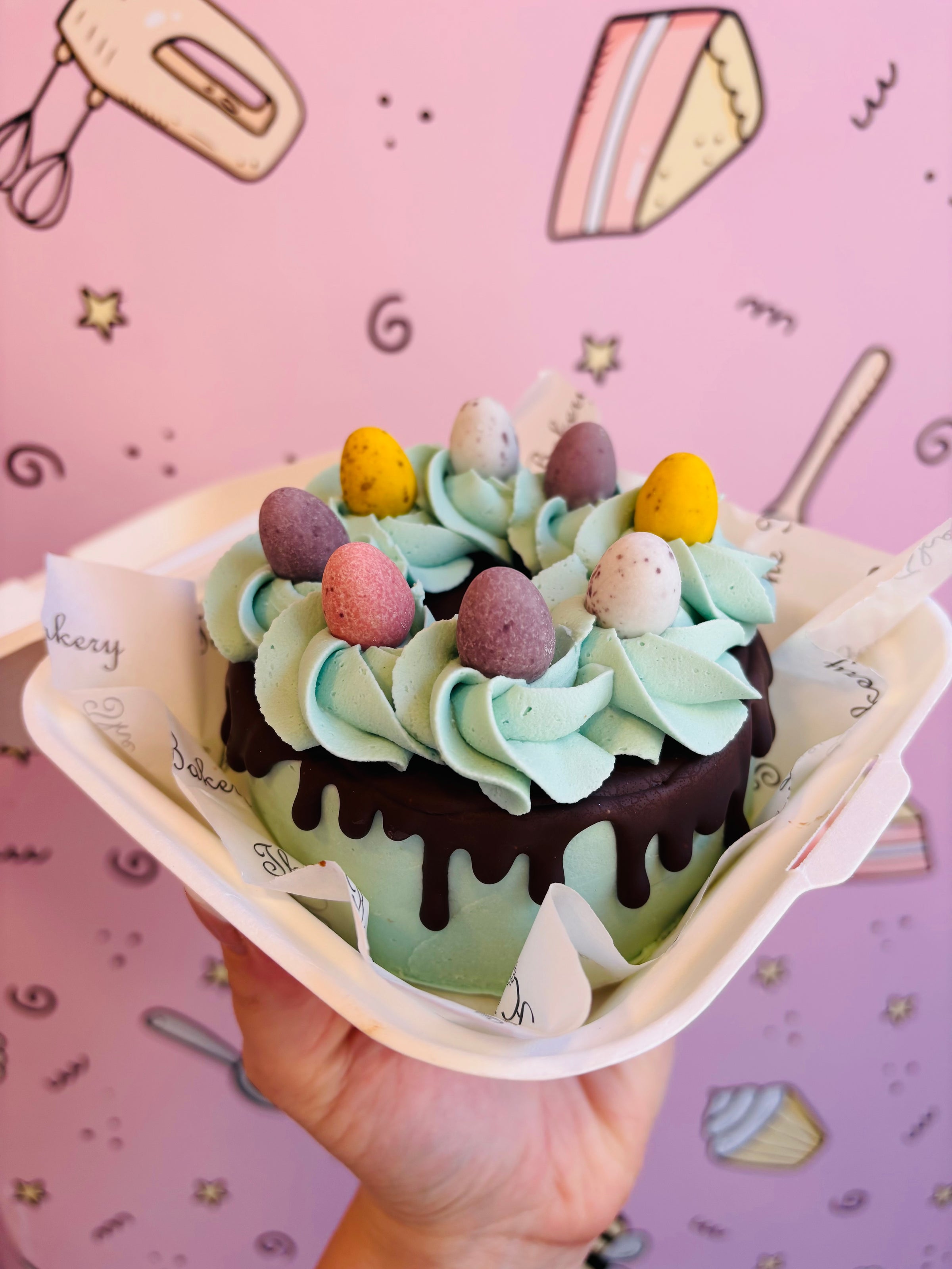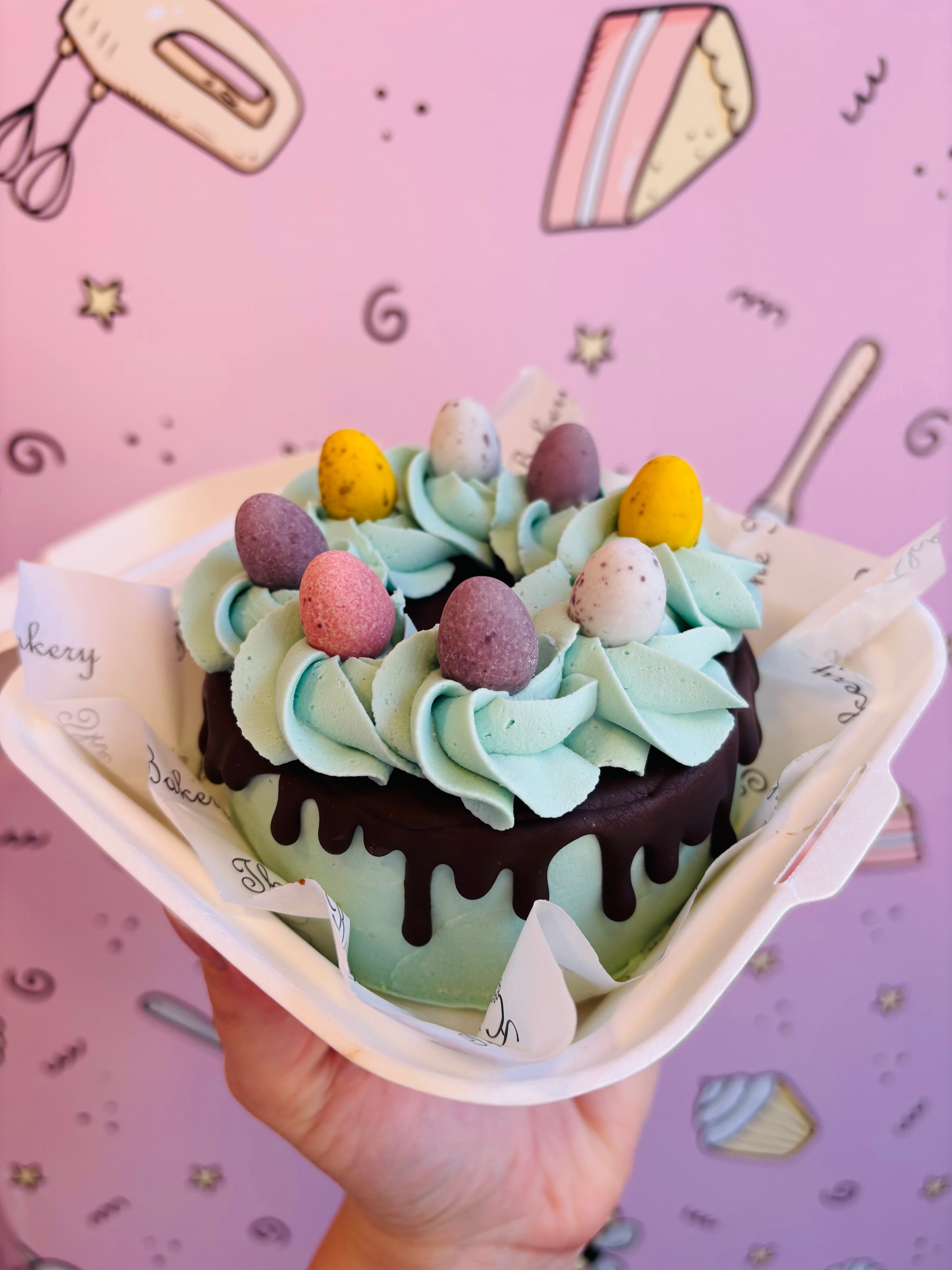 Allergens:Butter (Milk) Minimum 80% Butter fat. Caster sugar.Eggs. Wheat Flour (with Calcium, Iron, Niacin, Thiamin) May contain Soya, Egg & Milk. For allergens including Cereals containing Gluten see ingredient list in bold. Baking powder Raising Agents (E 450 (Diphosphates), E 500 (Sodium Carbonates)), Maize Starch.vanilla extract. Milk. Icing sugar. Soft Cheese Skim Milk , Cream (Milk), Lactic Cultures. Salt, Preservative (potassium Sorbate) Stabilisers: Carrageenan, Locust Bean Gum. Fondant icing sugar, glucose syrup, water, humectant: vegetable glycerine E422, palm oil*, emulsifier: mono & diglycerides of fatty acids E471, stabiliser: Gum Tragacanth E413, preservative: Potassium sorbate E202, natural vanilla flavouring Butter (Milk) Minimum 80% Butter fat. Caster sugar.Eggs. Wheat Flour (with Calcium, Iron, Niacin, Thiamin) May contain Soya, Egg & Milk. Cocoa powder. For allergens including Cereals containing Gluten see ingredient list in bold. Baking powder Raising Agents (E 450 (Diphosphates), E 500 (Sodium Carbonates)), Maize Starch.vanilla extract. Milk. Icing sugar. Soft Cheese Skim Milk , Cream (Milk), Lactic Cultures. Salt, Preservative (potassium Sorbate) Stabilisers: Carrageenan, Locust Bean Gum. Ganache: Dark Chocolate Cocoa Mass- sugar-Cocoa butter, emulsifier: Soy Lecithin (E322)- flavouring natural Vanilla Double cream (MILK), mini eggs Sugar, Milk, Cocoa Butter, Cocoa Mass, Skimmed Milk Powder, Whey Permeate Powder (from Milk), Vegetable Fats (Palm, Shea), Milk Fat, Modified Starches (Maize, Tapioca), Emulsifiers (E442, E476), Flavourings, Maltodextrin, Colours (Anthocyanins, Beetroot Red, Paprika Extract, Carotenes), Milk Chocolate: Milk Solids 14 % minimum, Cocoa Solids 25 % minimum, Contains Vegetable Fats in addition to Cocoa Butter, creme eggs Sugar, Milk, Glucose Syrup, Cocoa Butter, Invert Sugar Syrup, Whey Powder (from Milk), Cocoa Mass, Vegetable Fats (Palm, Shea), Emulsifier (E442), Dried Egg White, Flavourings, Colour (Paprika Extract), Milk Chocolate: Milk Solids 14 % minimum, Contains Vegetable Fats in addition to Cocoa Butter, malteaser bunny Sugar, Palm Fat, Barley Malty Extract, Cocoa Butter, Skimmed Milk Powder, Full Cream Milk Powder, Glucose Syrup, Demineralised Whey Powder (Milk), Shea Fat, Lactose, Milk Fat, Cocoa Mass, Emulsifier (Soya Lecithin), Wheat Flour, Whey Permeate (from Milk), Raising Agents (E341, E500, E501), Salt, Wheat Gluten, Whey Powder (Milk), Vanilla Extract