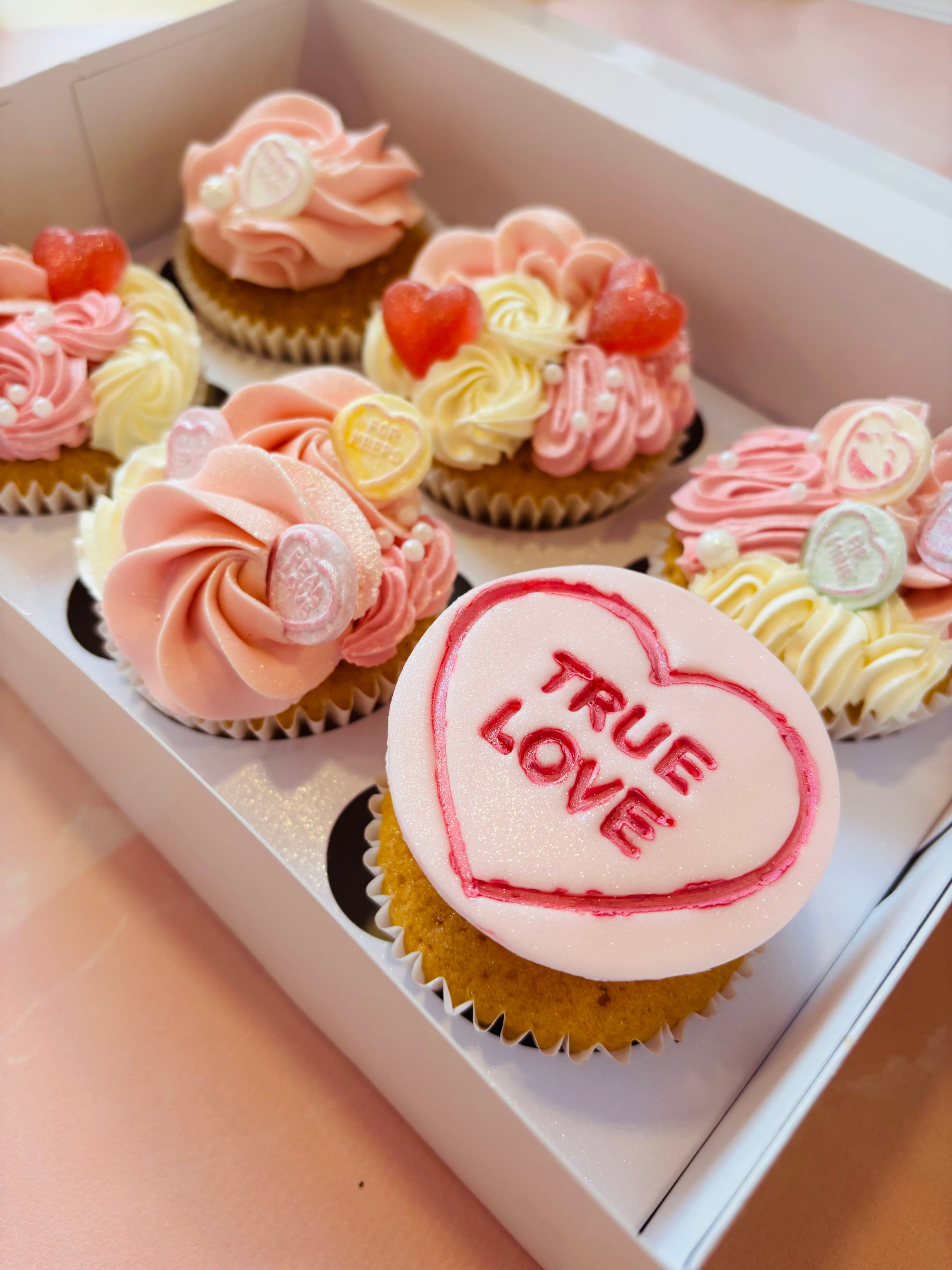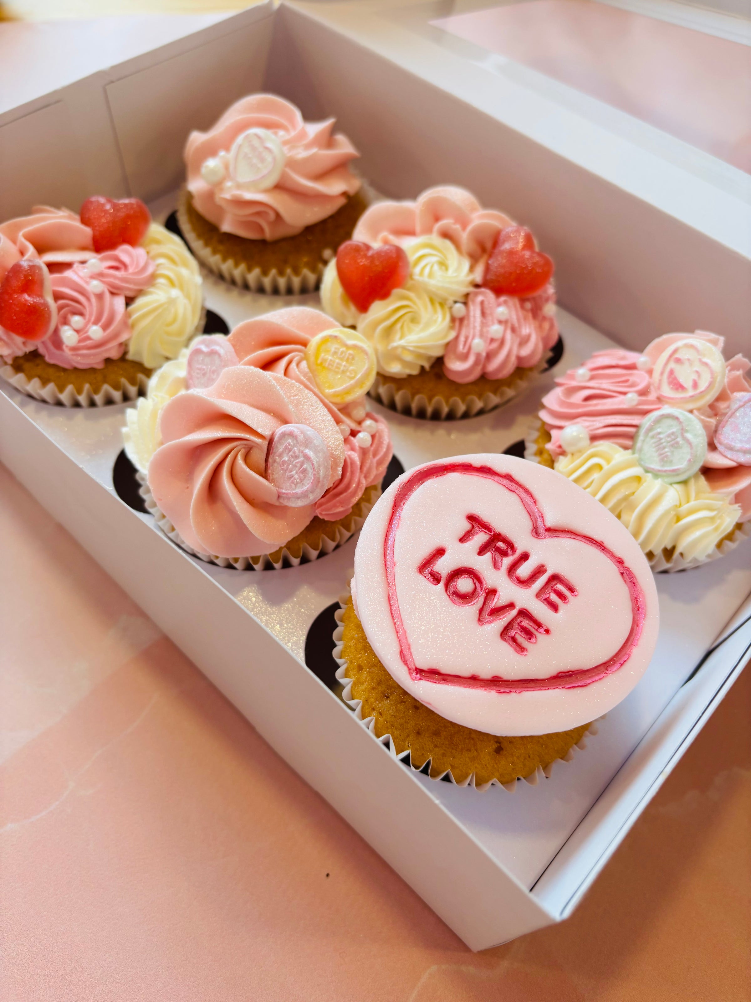 Box of 6 Valentines themed vanilla cupcakes.